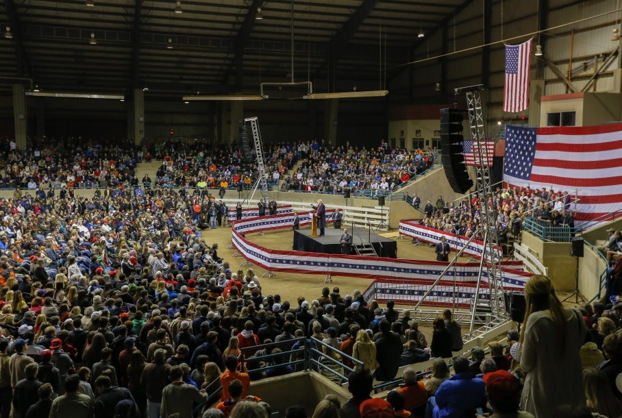 Trump took the stage in a black overcoat and enough confidence and swagger to criticize his own rally venue — a dirt-floored livestock arena at Clemson University that lacked heat and featured two massive John Deere tractors. “What is this? It’s beautiful… Little bit on the cold side. I don’t usually do this” — he grabbed the lapels of his coat and shook them — “but figure we might as well.”