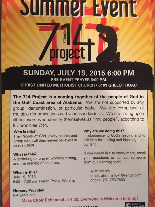 After much prayer and consideration, on the part of the 714 Project Board, we are all in agreement that the Lord has accomplished what He set out to do with the 714 Project. As of now we are not planning any new 714 Project events. Our mission remains the same, “If my people who are called by my name, will humble themselves and pray and seek my face…” While the 714 Project may fade at this time we know that the mission continues. We are grateful for the experiences, prayers, worship, and service that we have all experienced through this ministry, and now we are excited to see what God will continue to do in the city of Mobile. To God be the glory.