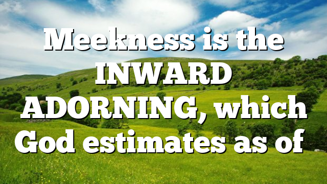 Meekness is the INWARD ADORNING, which God estimates as of great price. The apostle speaks of this as more excellent and valuable than gold or pearls or costly array. While the outward adorning beautifies only the mortal body, the ORNAMENT of meekness ADORNS the soul and CONNECTS finite man with the infinite God. This is the ornament of God’s own choice. He who garnished the heavens with the orbs of light has by the same Spirit promised that “he will beautify the meek with salvation” (Psalm 149:4). Angels of heaven will register as BEST adorned those who put on the Lord Jesus Christ and walk with Him in MEEKNESS and lowliness of mind. {SL 16.2}