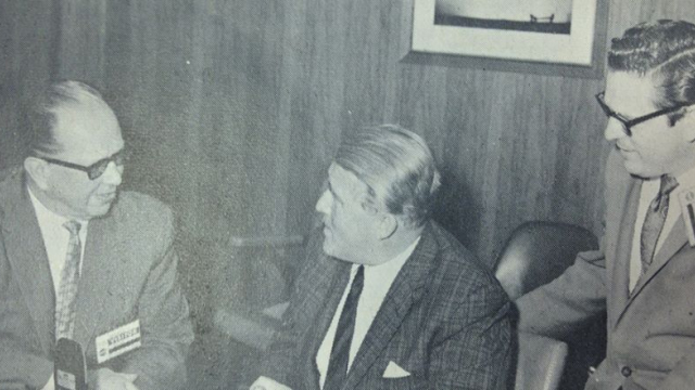 C.M. Ward interviews Dr. Wernher von Braun (center) in his office at the Space Center headquarters in Huntsville, Alabama, May 9, 1966. Lee Shultz (right) looks on.