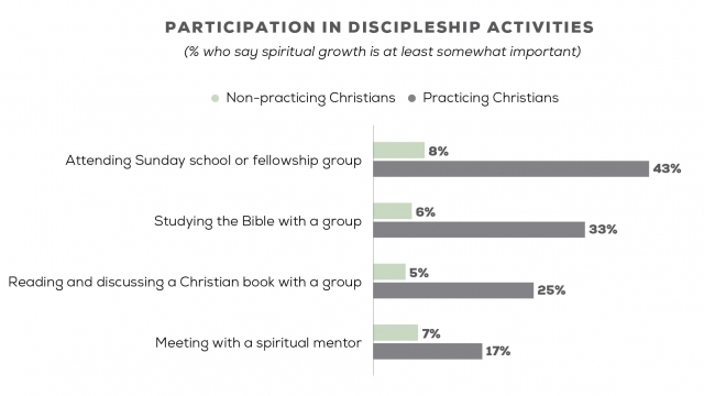 Despite believing their church emphasizes spiritual growth, engagement with the practices associated with discipleship leave much to be desired. For example, only 20 percent of Christian adults are involved in some sort of discipleship activity—and this includes a wide range of activities such as attending Sunday school or fellowship group, meeting with a spiritual mentor, studying the Bible with a group, or reading and discussing a Christian book with a group.