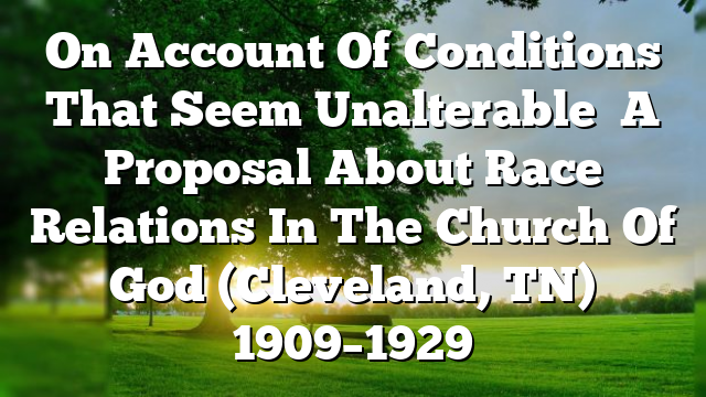 The saying that the most segregated hour in America is on Sunday morning at eleven o’clock is attributed to Martin Luther King, Jr. But racial segregation has prevailed not just in single-race congregations, but in whole denominations that cater to only one race or ethnic group. The Civil Rights Movement compelled many American churches to face the difficult matter of race for the first time, but American Pentecostal churches struggled with racial integration as early as 1906. Growing out of the late- nineteenth-century Holiness movement, and first organized as the Christian Union in August 1886, the Church of God (Cleveland, TN) attempted to combine blacks and whites into one organization during the height of Jim Crow. But truthfully, between 1909 and 1929, the Church of God was neither fully “integrated” nor a “whites only” church.