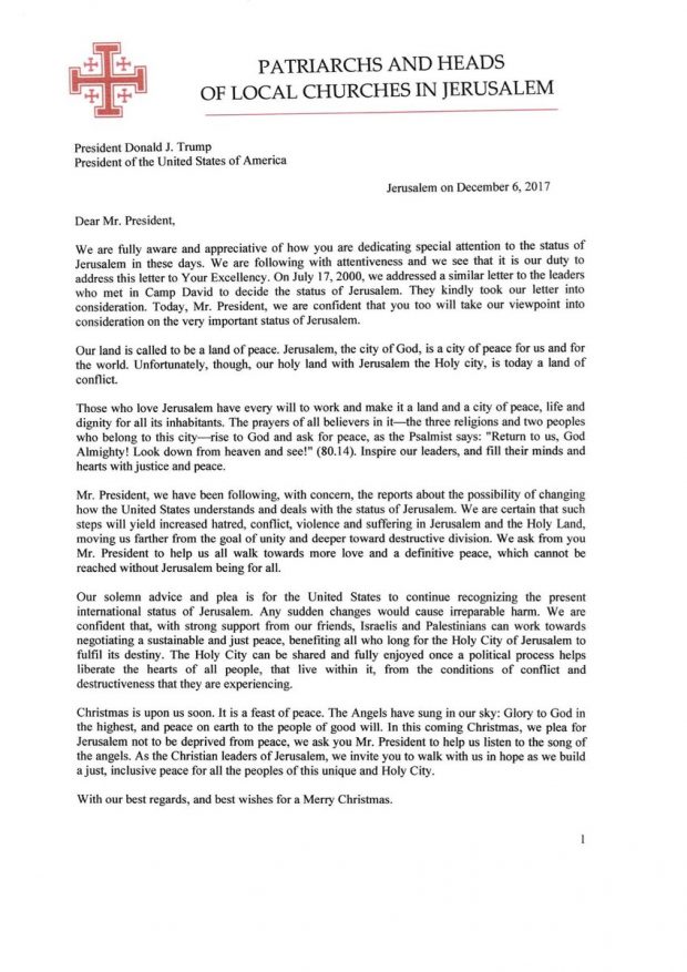 “We ask from you, Mr President, to help us all walk towards more love and a definitive peace, which cannot be reached without Jerusalem being for all.” https://www.timesofisrael.com/heads-of-jerusalem-churches-deliver-last-minute-plea-to-trump/