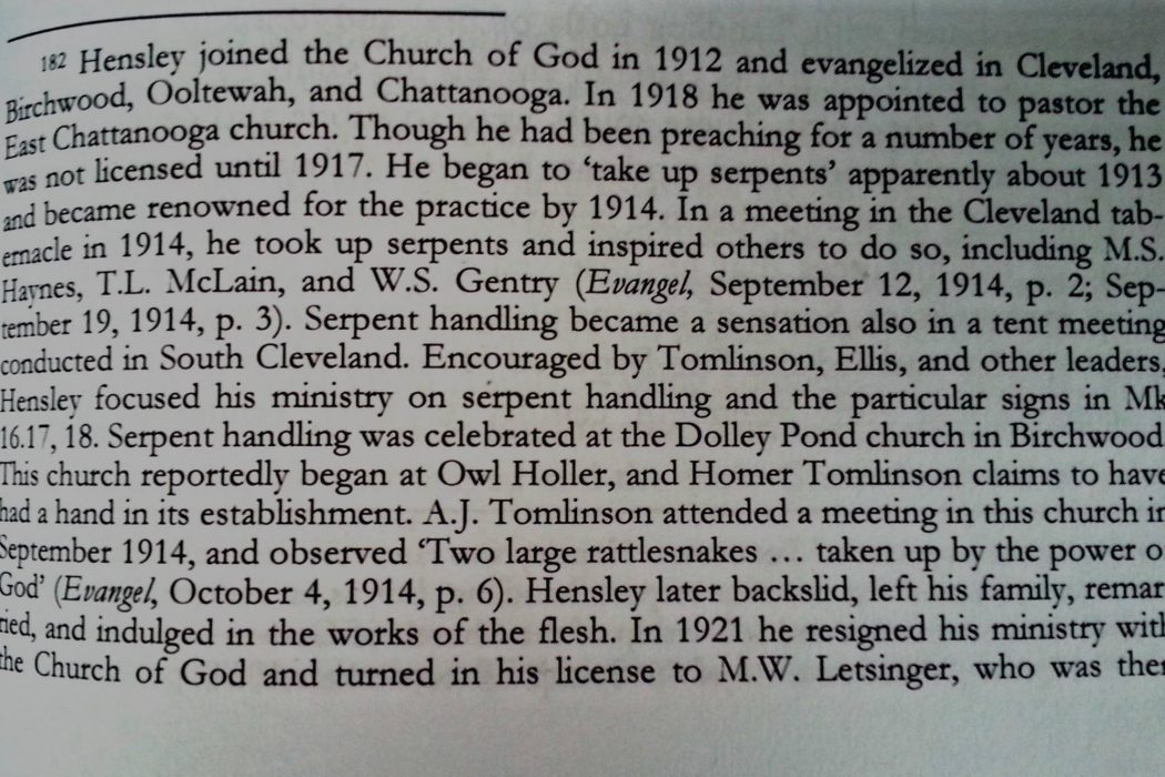 The conversation here is on the obviously prominent historical role of snake handling within the historical development of Pentecostal faith in the Appalachians starting with Tennessee preacher named George W. (“Little George”) Hensley. Hensley’s experience spread throughout the Appalachian region and soon caught the attention of A. J. Tomlinson, then General Overseer of the Church of God. He ordained Hensley into the denomination (though there is no record of Tomlinson handling snakes, his daughter did).